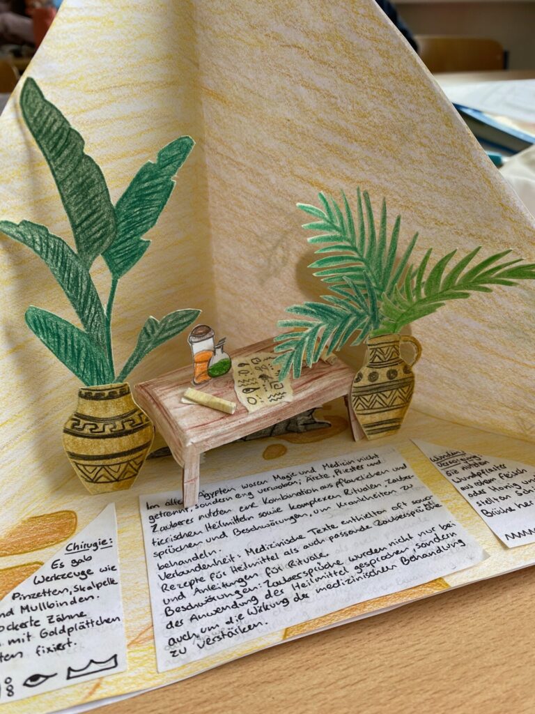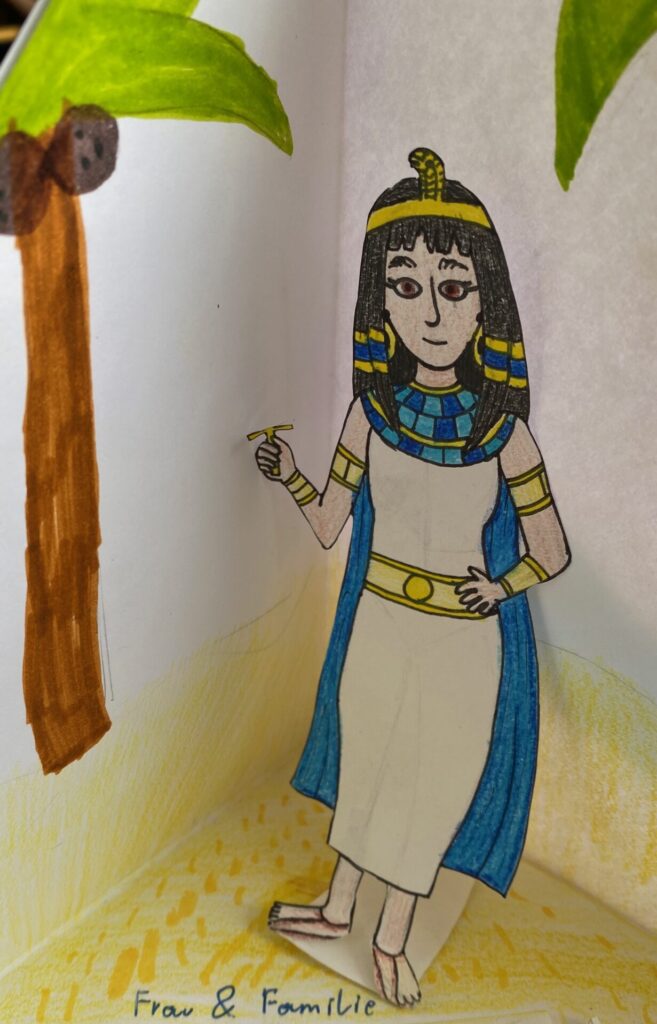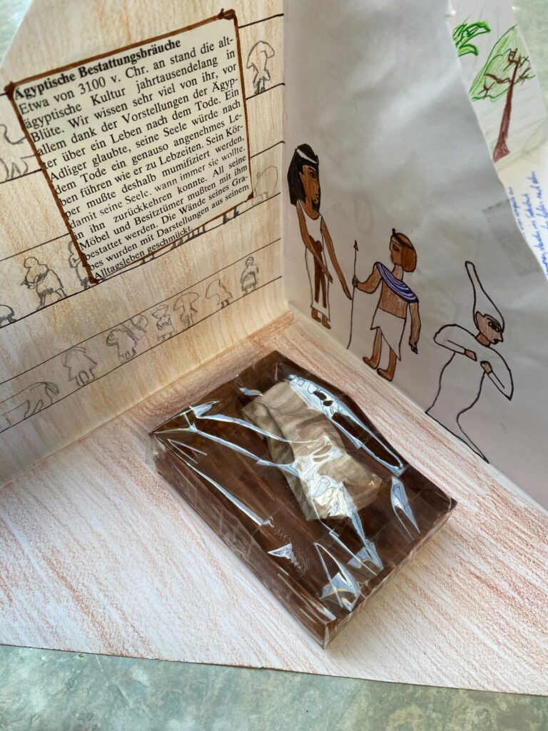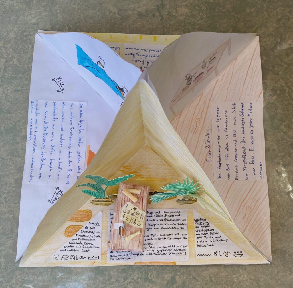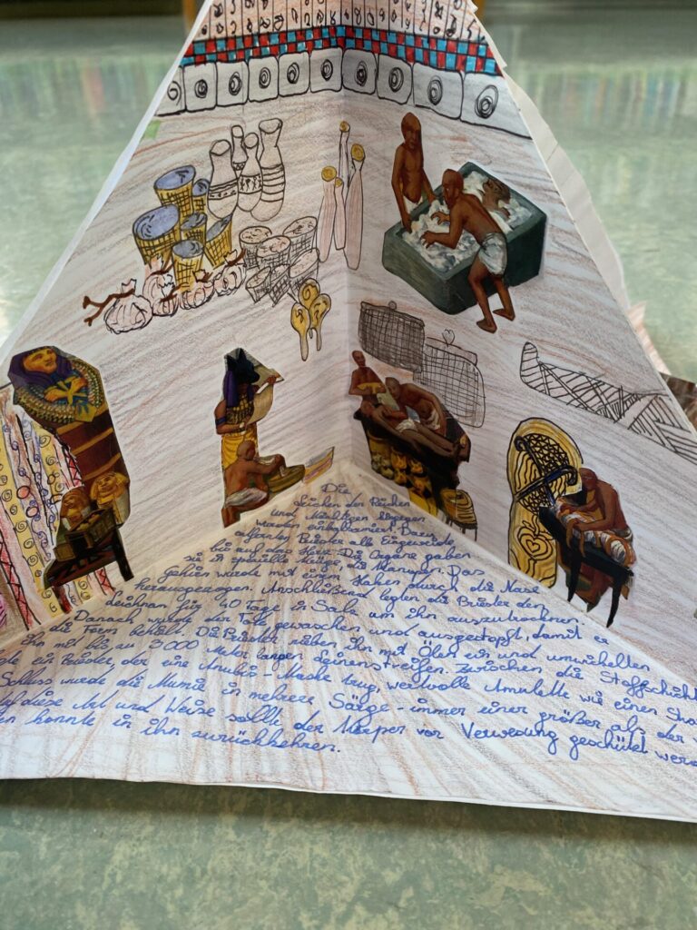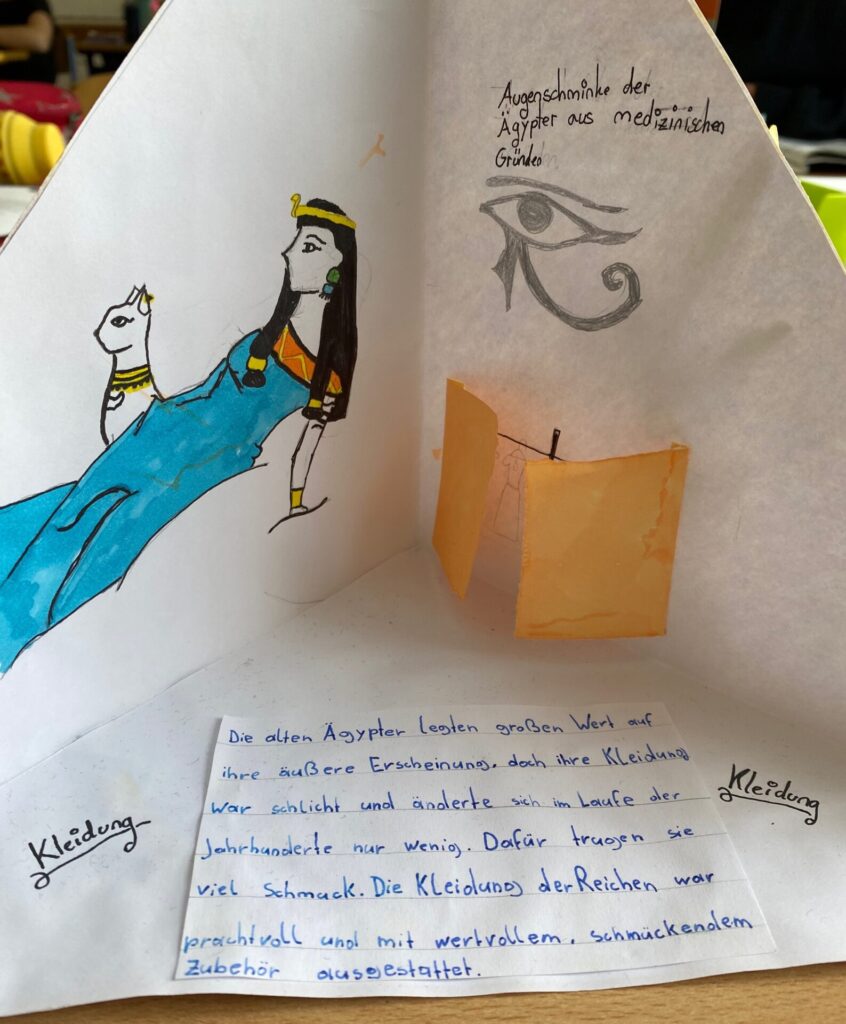 Dass bei den alten Ägyptern einiges los war, erforschte die 2D gründlich im Geschichtsunterricht mit Prof. Matl. So beschäftigten sie sich mit der Frage, wie die Menschen damals gelebt, gearbeitet und woran sie geglaubt haben. Sichtbar gemacht wurden die Themen (u.a. Gesellschaft, Schönheit, Schrift, Götter, Pyramiden oder das Leben nach dem Tod) in wunderschön gestalteten Quadramen.