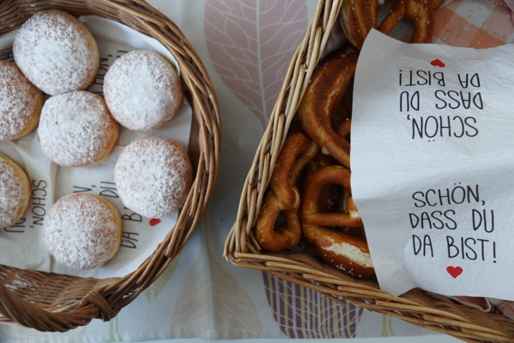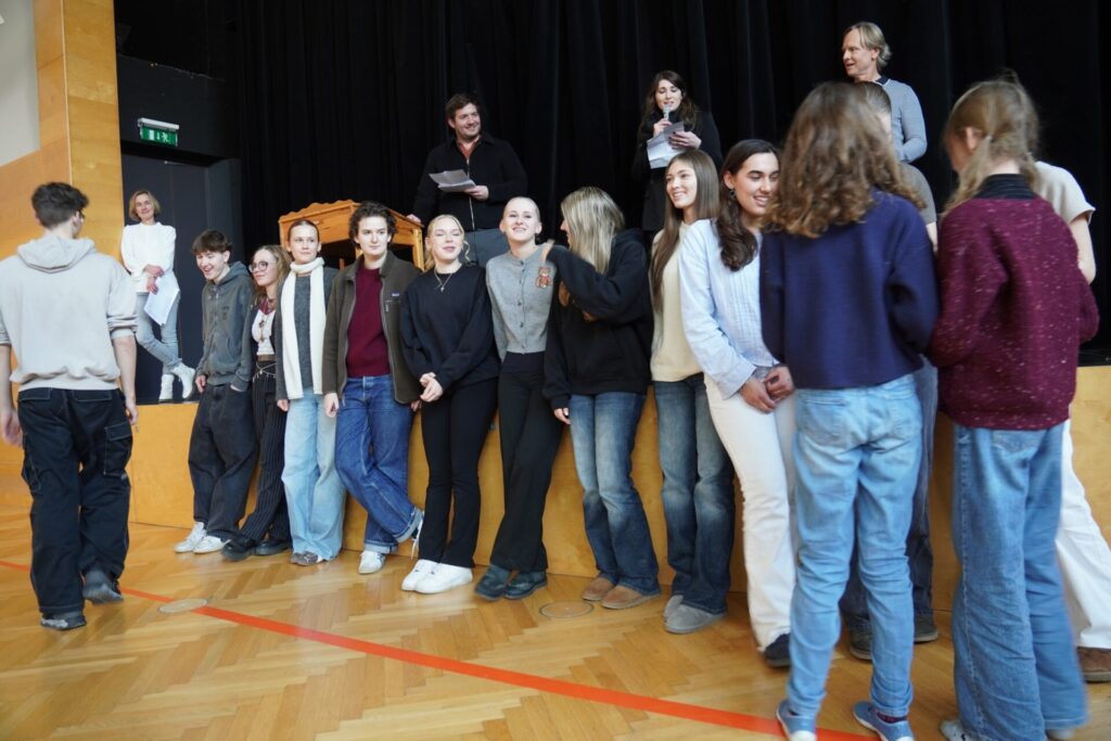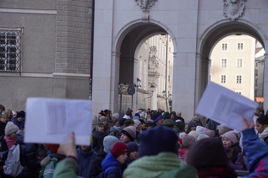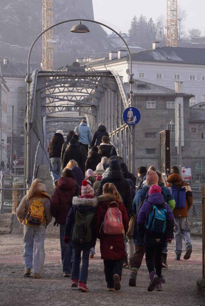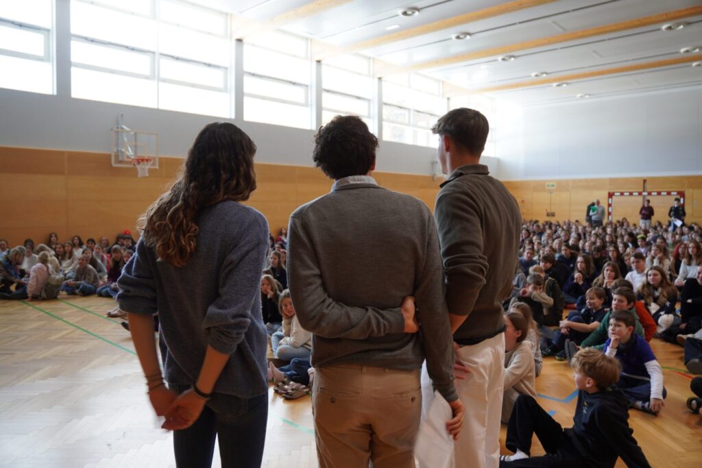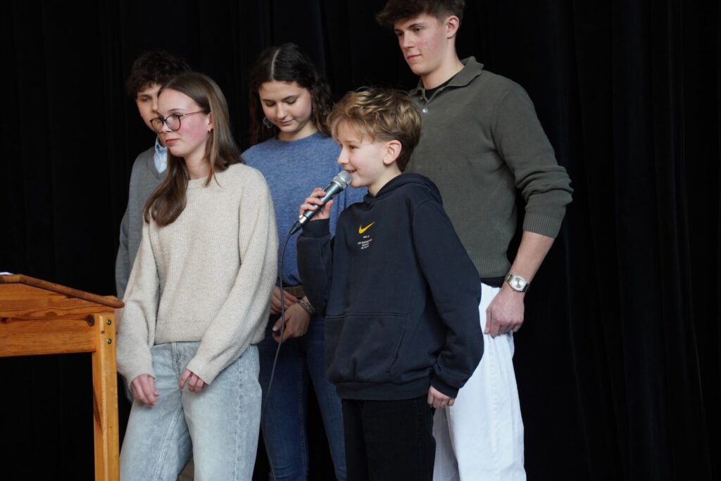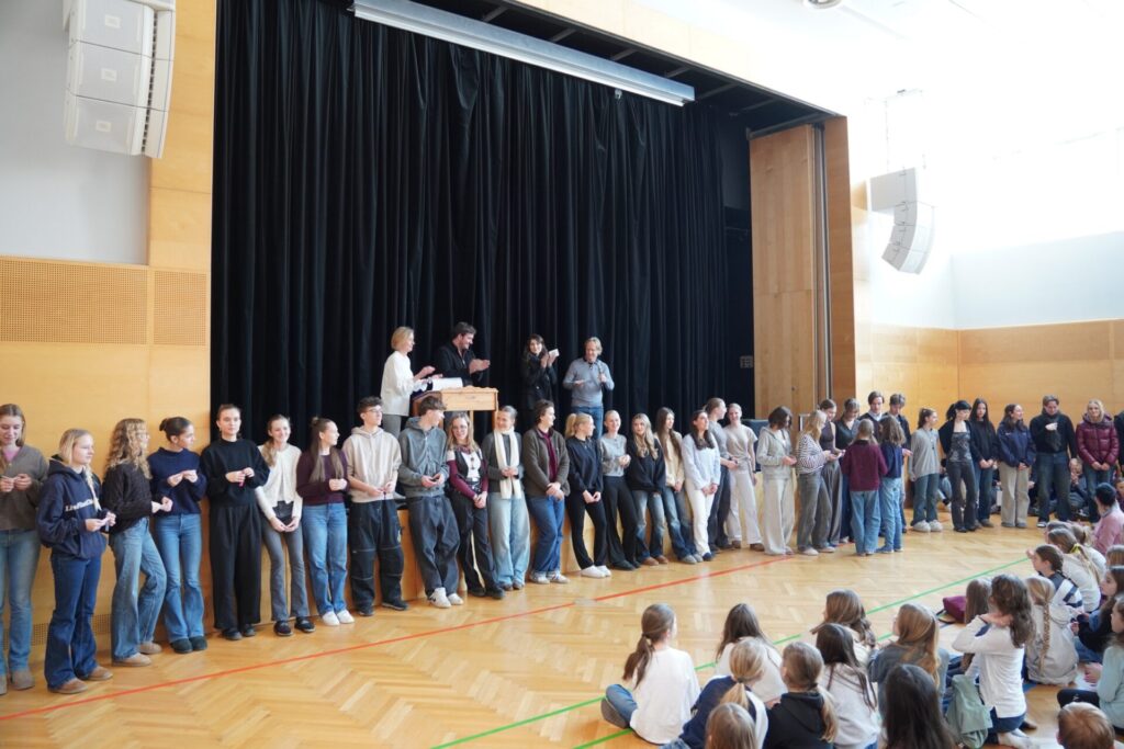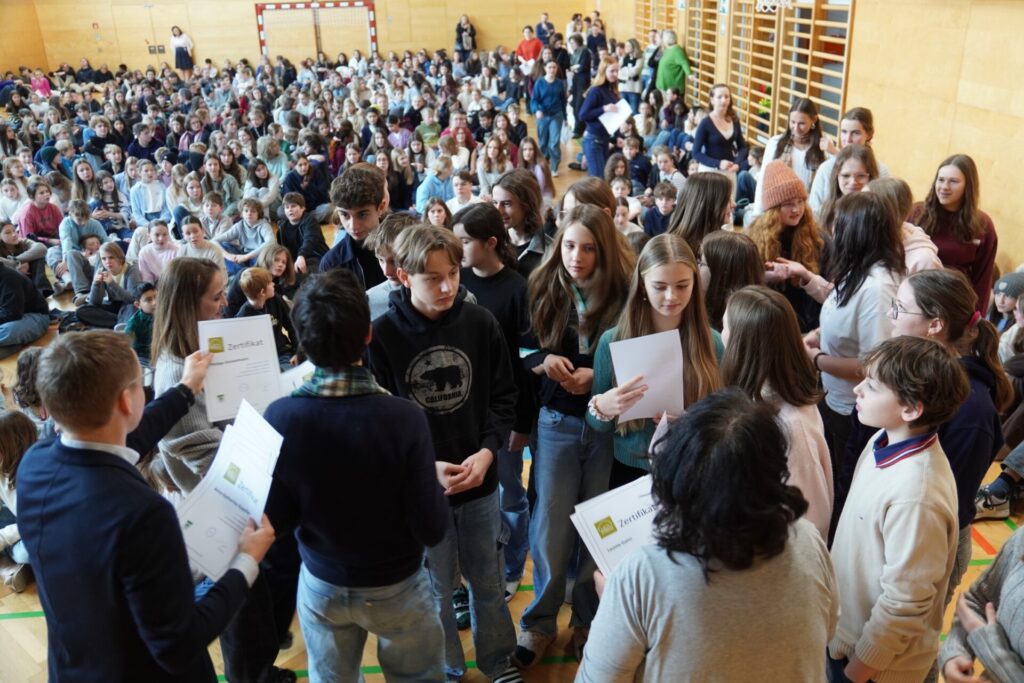 Im Anschluss machten wir uns auf den Rückweg zur Schule. Bei Brezen und Faschingskrapfen konnten wir uns von den Strapazen des Fußmarsches erholen und neue Energie tanken. Bevor wir schließlich ins wohlverdiente Wochenende starteten, versammelten wir uns noch einmal kurz im Festsaal. Dort wurden verdiente Urkunden an Schüler:innen überreicht, und die Erstklässler übergaben ihre liebevoll selbstgebastelten Glücksbringer an die 8. Klassen – ein besonders schöner Abschluss unseres Angelatages.