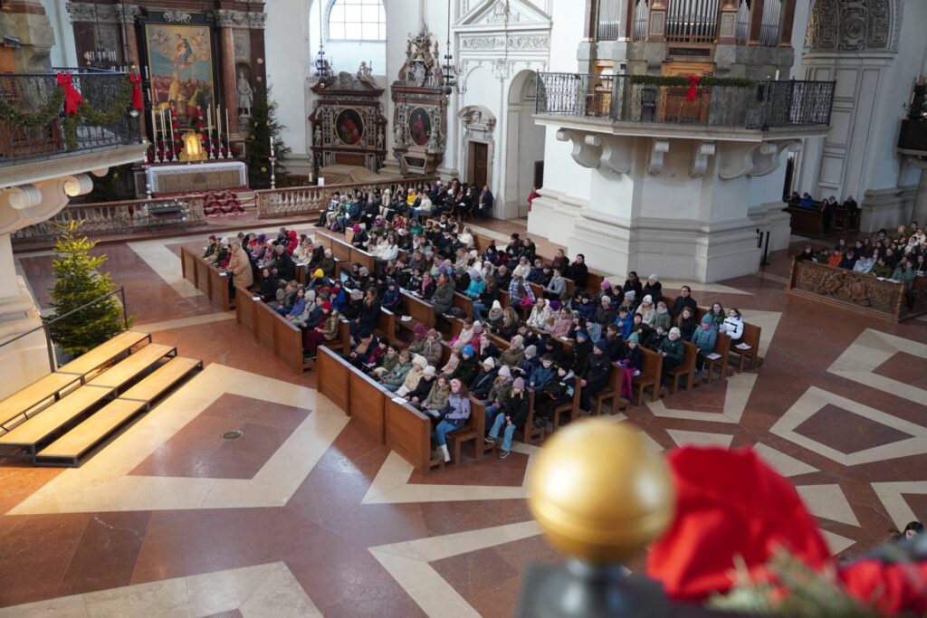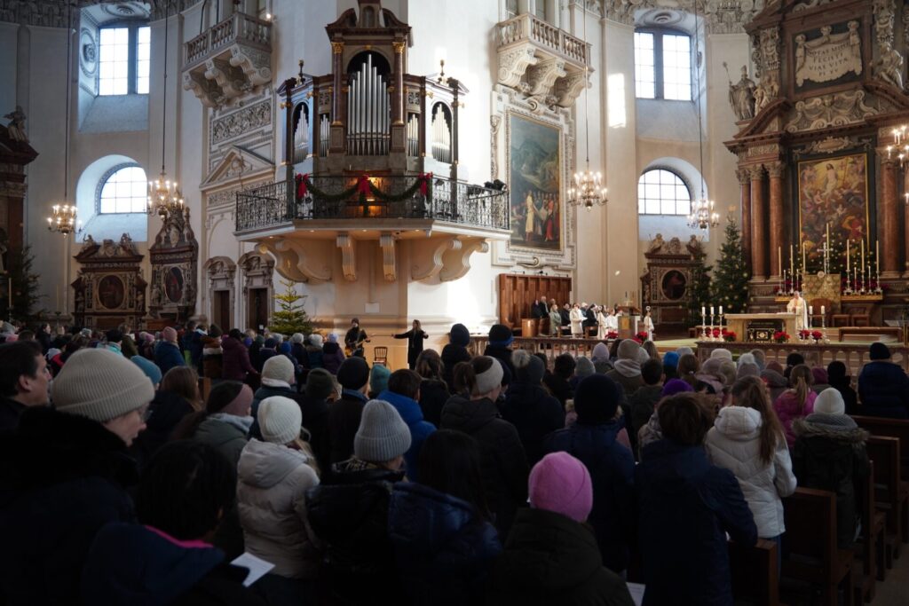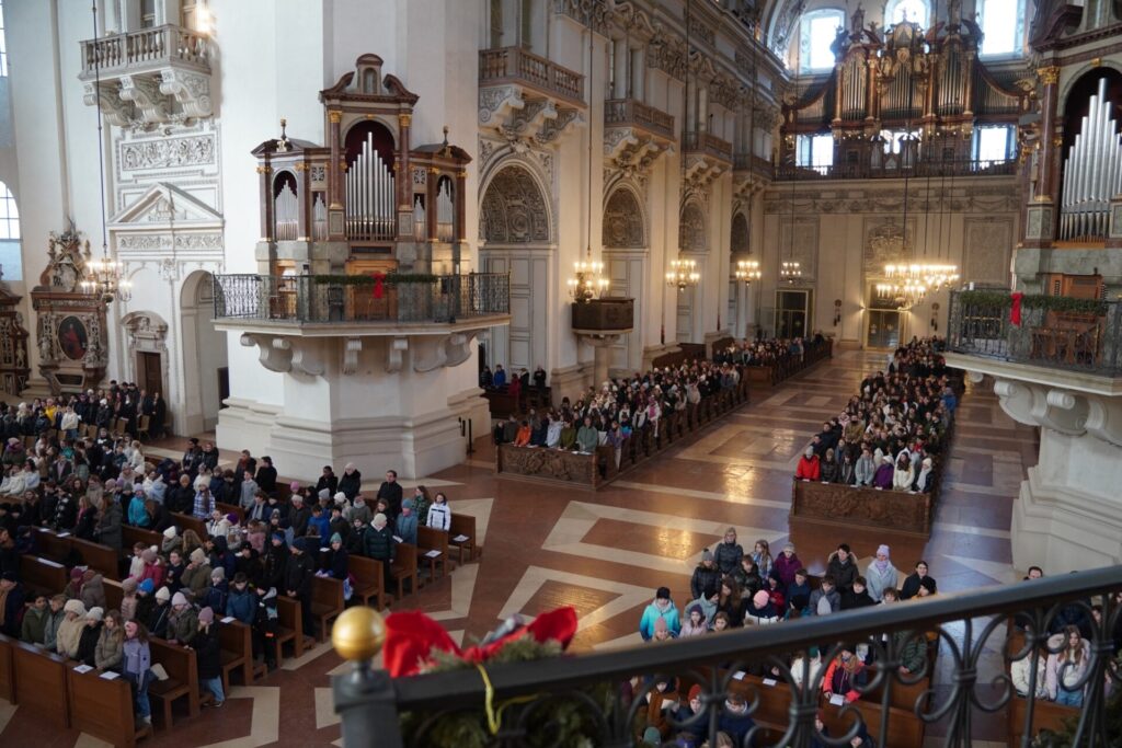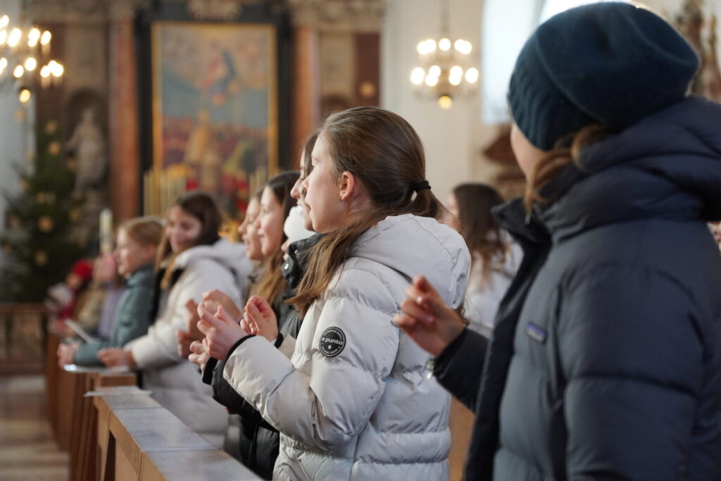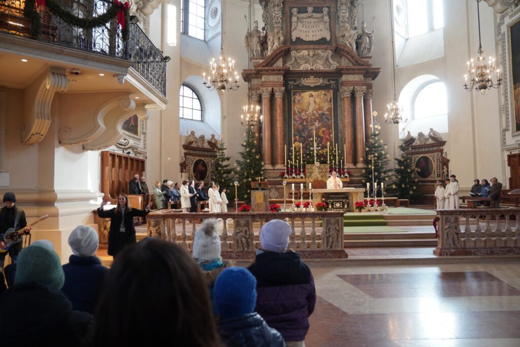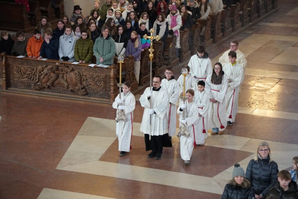 Bei strahlendem Sonnenschein und klirrender Kälte durften wir bereits zum vierten Mal unseren Angelagottesdienst im Dom feiern. Zum ersten Mal begleitete uns dabei Pater Virgil aus St. Peter, der mit seiner herzlichen, bayrisch-lockeren Art der Messe eine ganz besondere Atmosphäre verlieh.