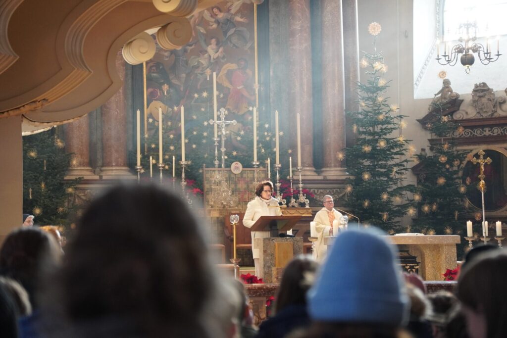 Beeindruckend war auch der Anblick, wie unsere mittlerweile große Schulgemeinschaft den Dom bis in die letzte Reihe füllte. Ganz besonders gefreut haben wir uns über den Besuch unserer Ehrengäste: Sr. Gabriela, Sr. Maria und Sr. Mariangela, die es sich nicht nehmen ließen, mit uns gemeinsam diesen festlichen Gottesdienst zu feiern.