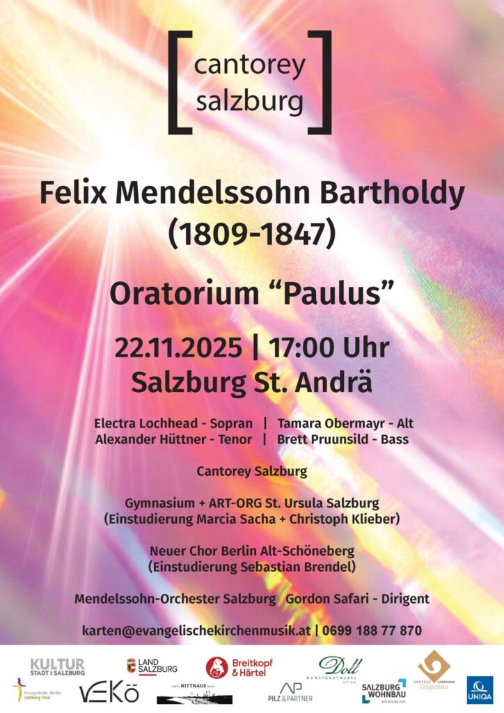 Mitte November wirkt unser Oberstufenchor unter der Leitung von Christoph Klieber und Marcia Sacha gemeinsam mit der Cantorey Salzburg und dem Neuen Chor Alt-Schöneberg aus Berlin am Oratorium “Paulus” von Felix Mendelssohn Bartholdy mit. Die erste Aufführung findet am 16. November in Berlin statt, die zweite eine Woche später, am 22. November in der Salzburger Andräkirche.