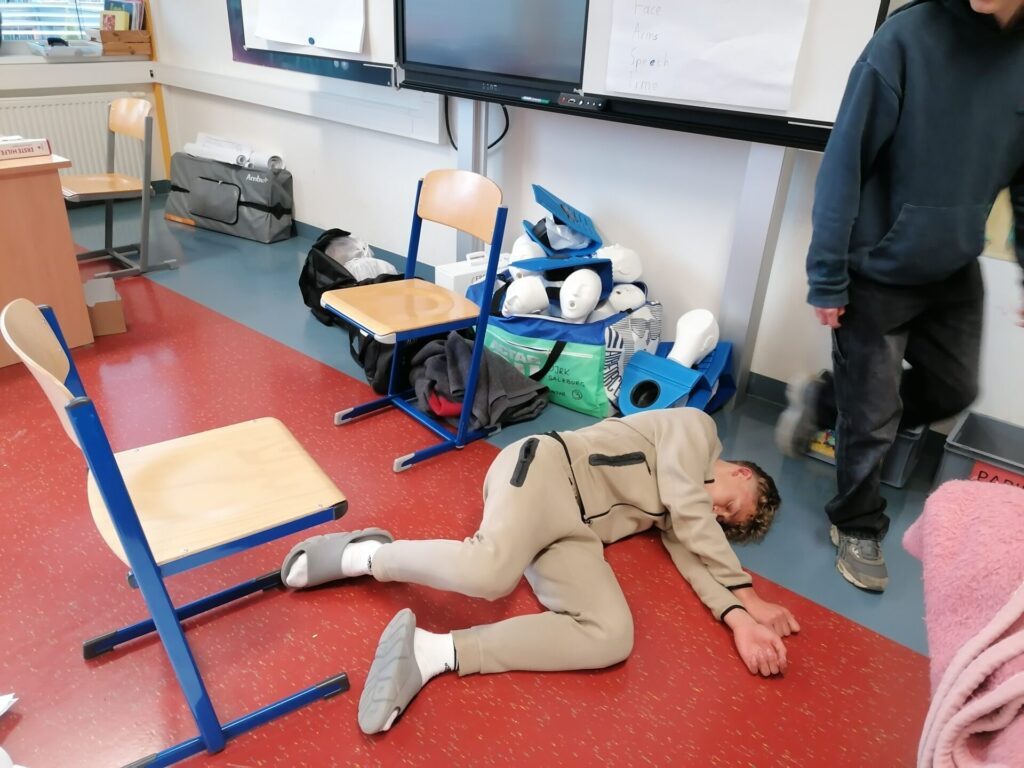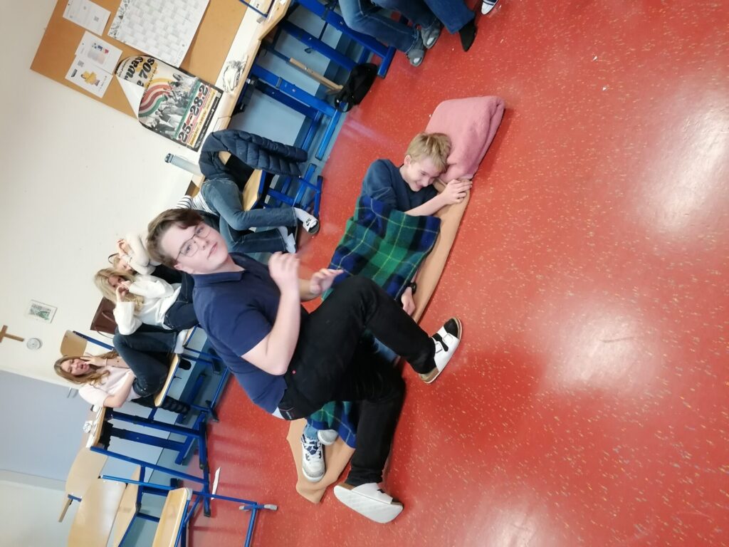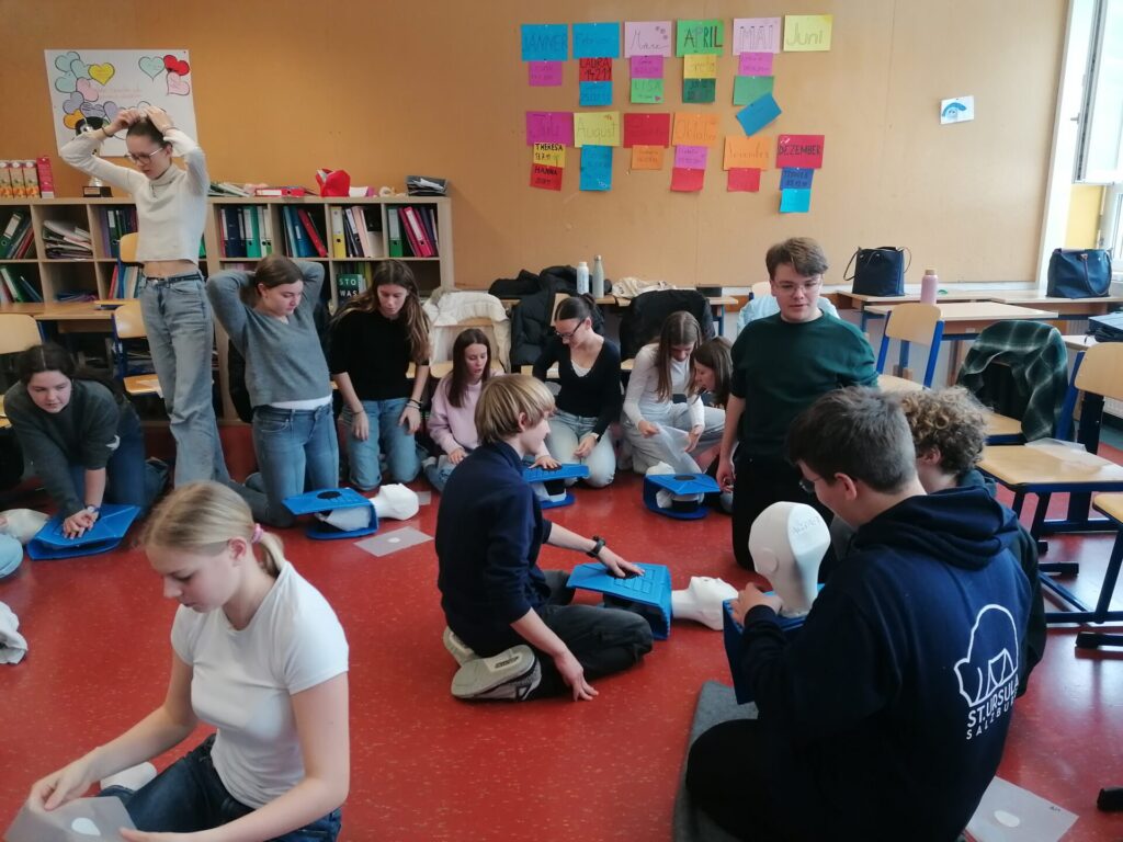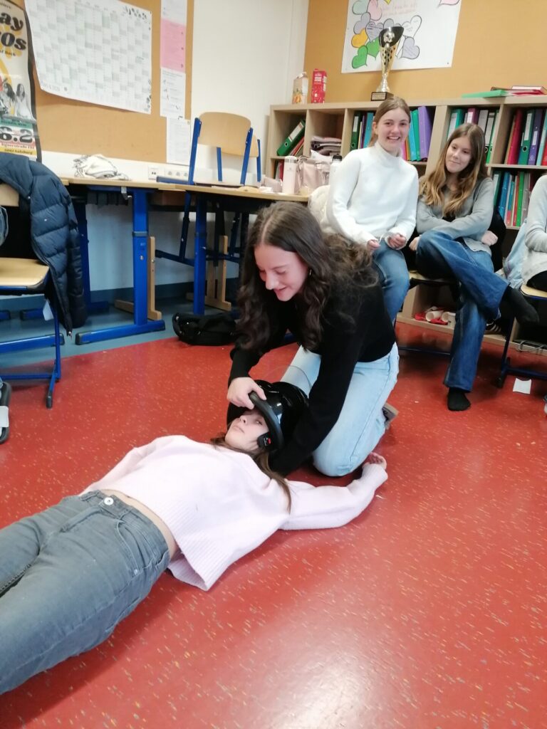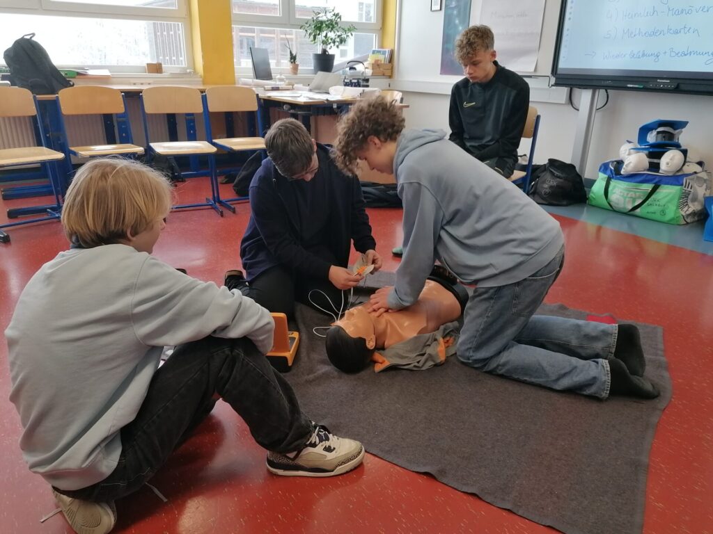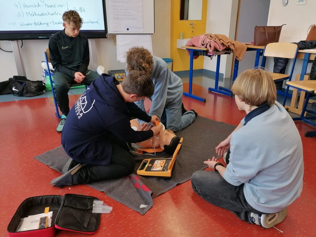 Unsere Klasse 5A hat einen 16-Stunden Erste-Hilfe-Kurs gemacht. Dabei haben wir gelernt, wie man in Notfällen richtig hilft. Zum Beispiel wie man jemanden wiederbelebt, jemanden in die stabile Seitenlage bringt und Wunden verbindet. Wir durften viel selber ausprobieren und üben, an unseren Freunden aber auch an Puppen. Das war am Anfang etwas schwierig, aber auch spannend. Der Kurs war interessant, weil viel Abwechslung dabei war. Wir haben viel gelernt und wissen jetzt besser, was man in einem Notfall tun muss. Außerdem wird der Kurs für unseren Führerschein angerechnet.