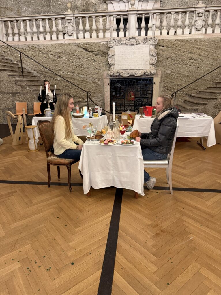 Die Theaterpädagogin Heide Binder von Akzente Salzburg begeistert mit einem leidenschaftlichen Vortrag zum „Ring der Nibelungen“. Anschließend öffnet sich der Blick hinter die Kulissen der Festspielbühnen. Bühnentechnik, Schneiderei, Requisiten, Spezialeffekte sowie Licht und Ton werden greifbar – ebenso wie die spannende Geschichte des Hauses.