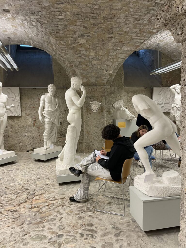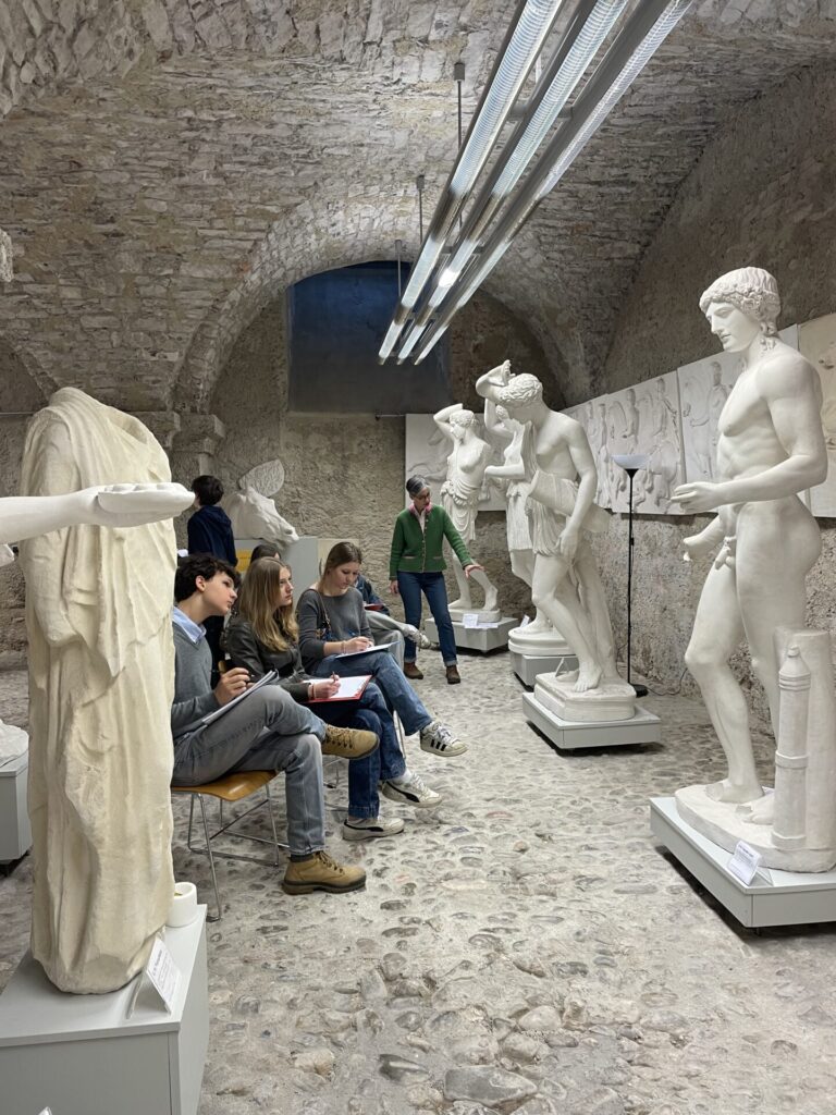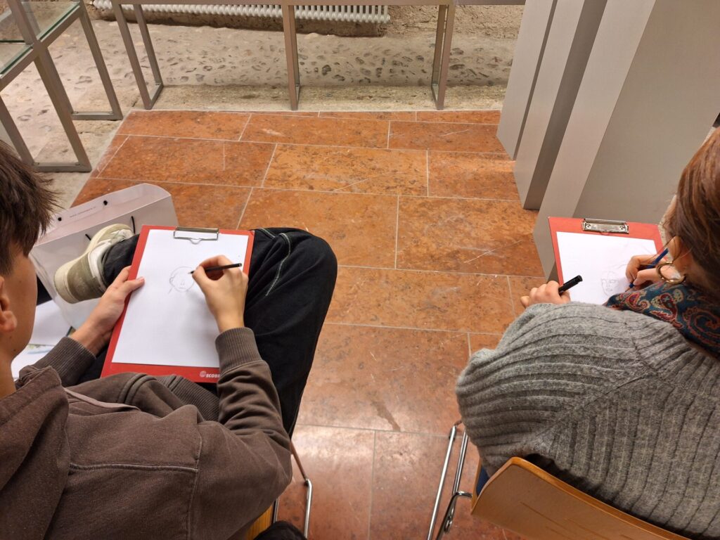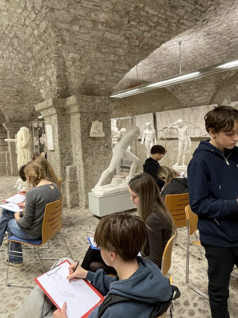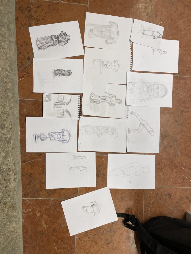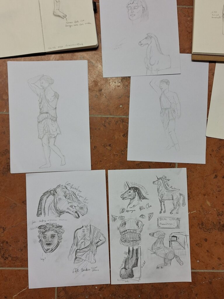 Wir hatten dort ungefähr eine Stunde Zeit, uns eine Figur auszusuchen, sie genau zu betrachten und anschließend abzuzeichnen. Dabei mussten wir besonders auf die Proportionen, Formen und Details achten. Die Kombination aus Betrachtung und eigener künstlerischer Tätigkeit half uns dabei, den dargestellten Figuren näherzukommen, sie in ihrer Gesamtheit zu betrachten und in ihrer Einzigartigkeit zu erfassen.