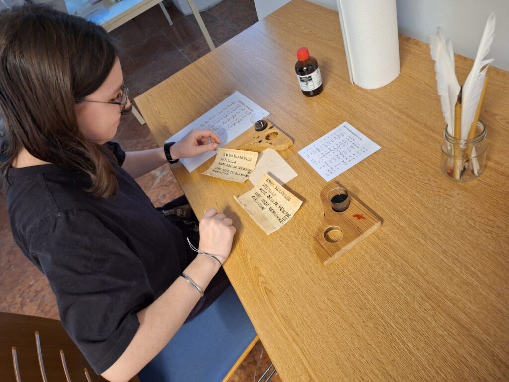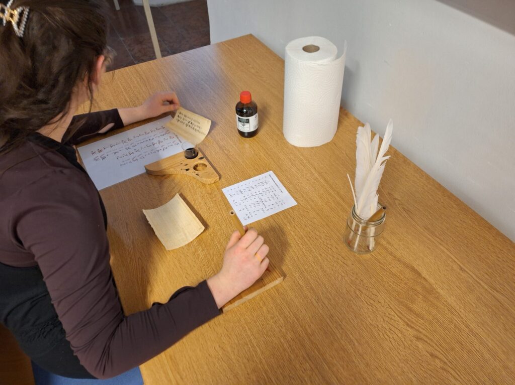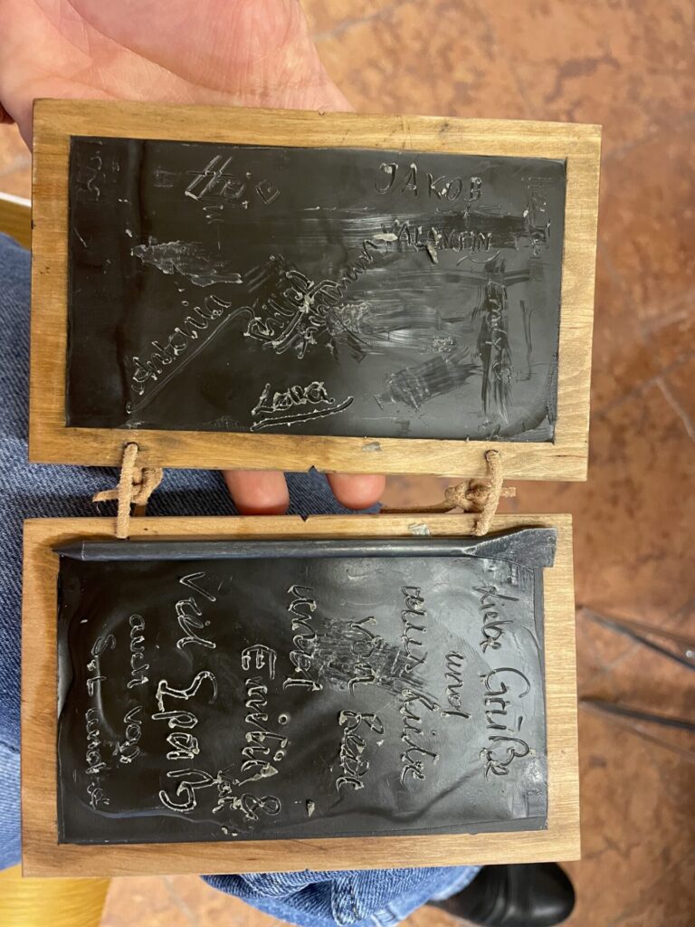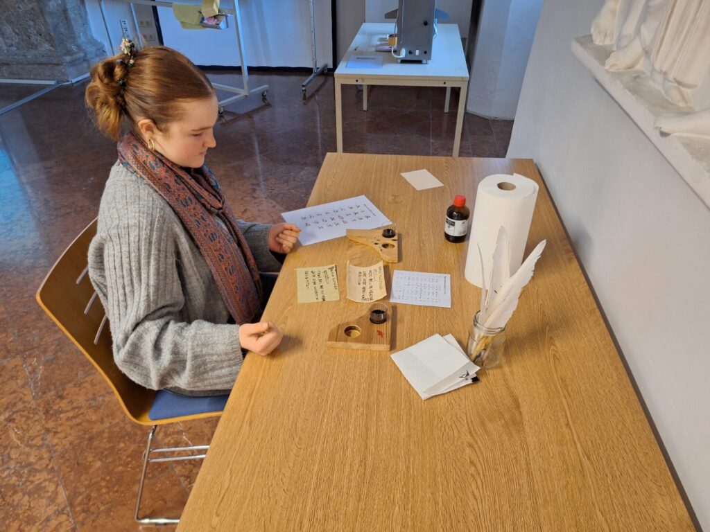 Im ersten Teil unseres Vormittags lernten wir über altertümliche Schriften und deren Überlieferung von der Antike über das Mittelalter bis in die Neuzeit. Wir gingen der Frage nach, wie sich über die Jahrtausende hinweg die Texte erhalten haben, die wir nun in unseren Schulbüchern vorfinden. Von der Tatsache, dass sich beim „Abschreiben“ auch immer wieder Fehler eingeschlichen haben, durften auch wir uns im Rahmen eines kleinen Experiments einen lebhaften Eindruck machen: Ein ursprünglich als Liebesgedicht gedachter Text von Catull verwandelte sich in ein Wirr-Warr von „Worten“.